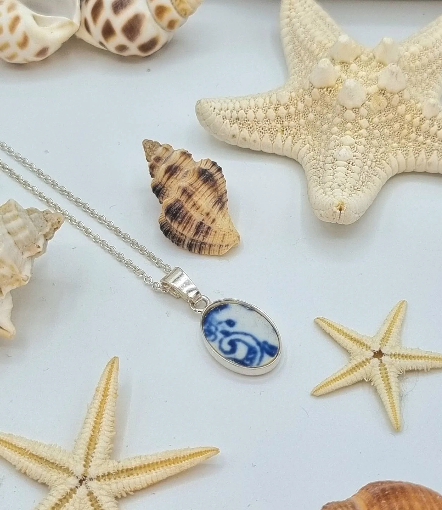 These pendant is made from beautiful blue & white patterned sea pottery, with sterling silver 18 inch chains and come in a recycled Kraft presentation box and jute gift bag. This will made a wonderfully unique gift.